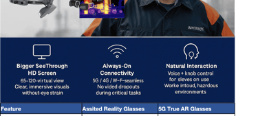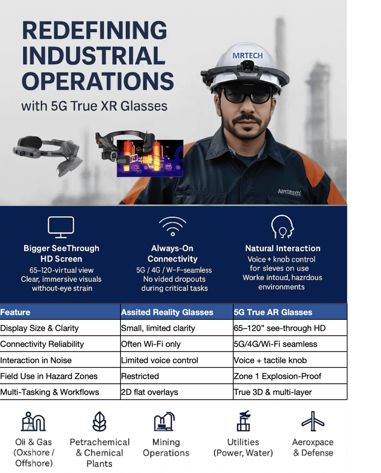 See More. Work Smarter. Stay Connected! In high-stakes industries like oil & gas, mining, utilities, and manufacturing, the difference between smooth operations and costly downtime often comes down to one factor: access to the right information, at the right time, in the right way. Augmented Reality (AR) is transforming the way organizations work — and with the arrival of 5G True XR Glasses, the potential has reached an entirely new level.